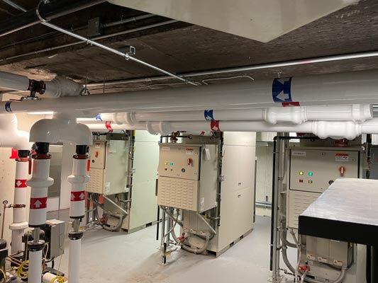 This CHeP system is installed at a multi unit residential building near the University of Ottawa. The project provides 195kW of power while providing heat to the domestic hot water and parking garage. During a utility power outage the system automatically transfers to stand alone operation providing power to the emergency load as the buildings backup generator. This projects design and installation meets C282.15.